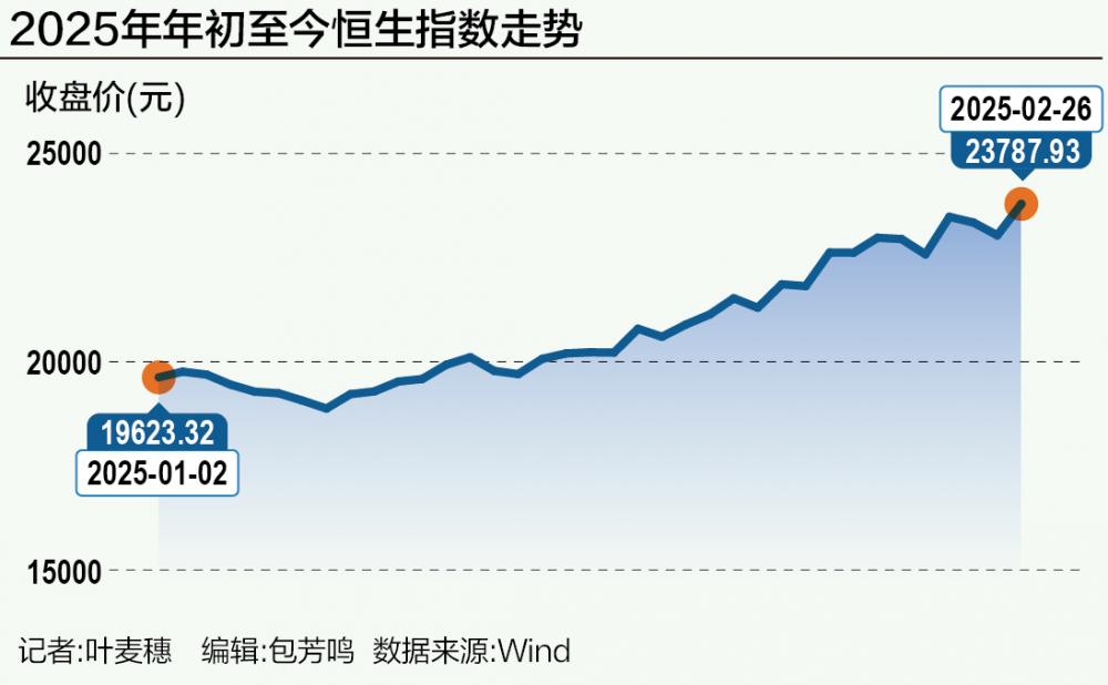 财政预算方案公布后,港股应声大幅上涨。截至2月26日收盘,恒生指数上涨至23787.93点,涨幅达到3.27%,恒生科技指数当日上涨4.47%,成为本轮港股上涨的“领头羊”。