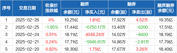 全志科技融资融券信息显示,2025年2月26日融资净买入1.81亿元;融资余额19.25亿元,创历史新高,较前一日增加10.4%。
