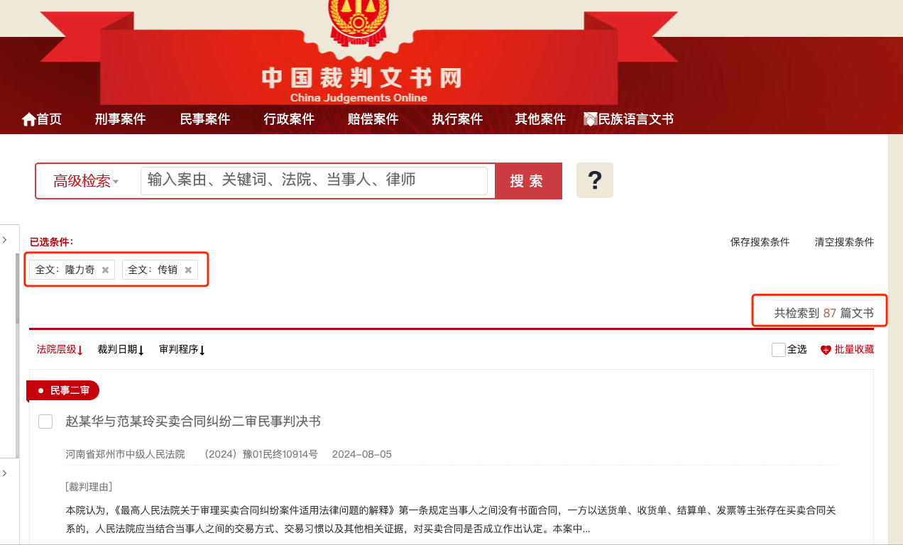 根据《直销管理条例》,直销应通过直销员直接向消费者销售产品获利,禁止团队计酬和多层返利,而隆力奇自2012年起被曝涉嫌违规操作。《财中社》从中国裁判文书网获悉,截至2月26日,关于“隆力奇”的裁判文书共831篇,同时检索“隆力奇”和“传销”共有87篇。
