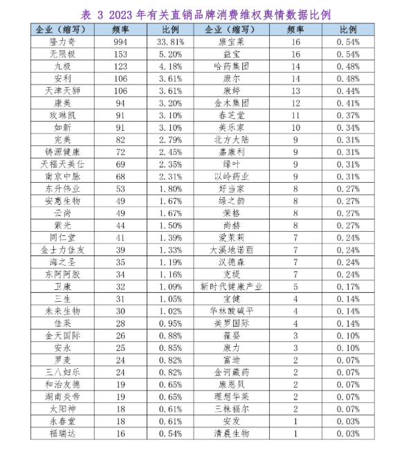 近年来,监管部门加大对直销行业的整顿力度。2023年,上海、广东等地出台反不正当竞争条例,要求严查直销企业挂靠行为;《直销行业消费维权舆情报告》显示,隆力奇2023年品牌消费维权舆情频率最高。
