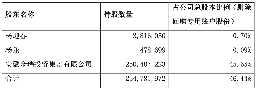 具体来看,公司实际控制人杨迎春及杨乐合计持有公司股份2.55亿股,其中杨迎春直接持有公司股份381.61万股(占公司剔除回购专用账户中股份数量后的总股本的0.70%),杨乐直接持有公司股份47.87万股(占公司剔除回购专用账户中股份数量后的总股本的0.09%),通过公司控股股东安徽金瑞投资集团有限公司(以下简称“金瑞投资”)间接持有公司股份2.50亿股(占公司剔除回购专用账户中股份数量后的总股本的45.65%)。