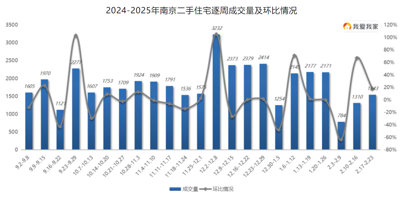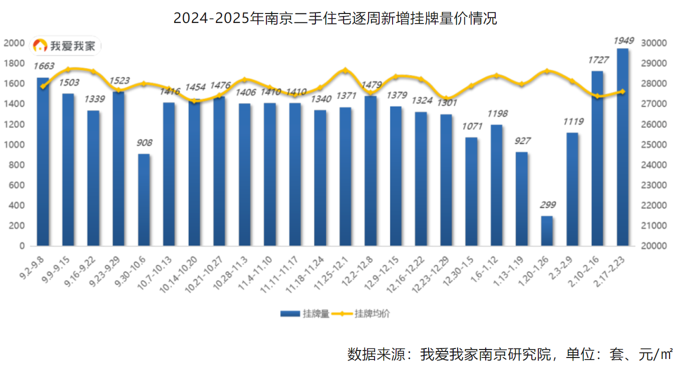 另据我爱我家南京研究院数据,南京二手房市场成交量已环比连续两周上涨,市场新增客户量、带看量也有所增加。与此同时,二手房业主挂牌积极性持续提升,上周(2月17日~23日)新增挂牌量创下近期新高。