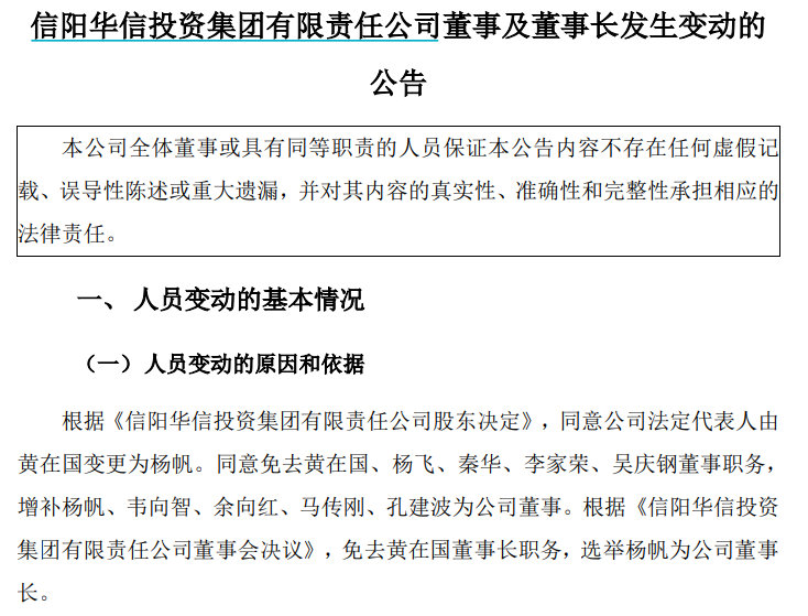 【大河财立方消息】2月27日,信阳华信投资集团公告,根据《信阳华信投资集团有限责任公司董事会决议》,免去黄在国董事长职务,选举杨帆为公司董事长。