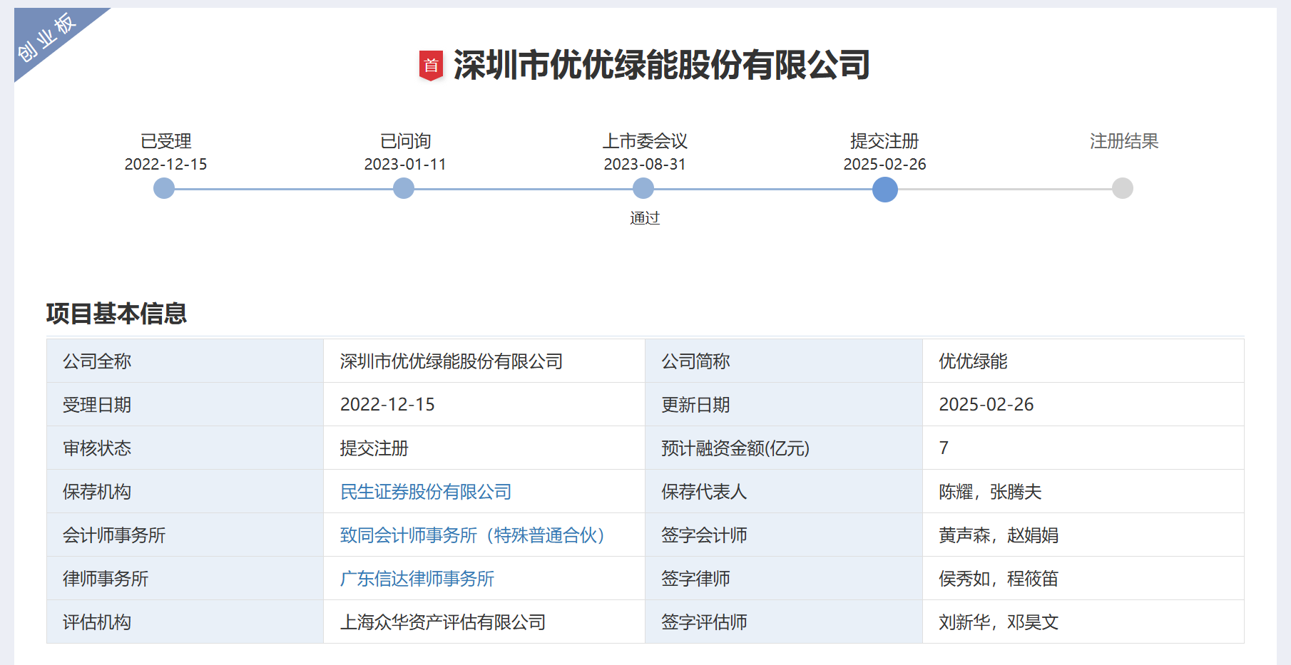 据深交所官网,2月26日,深圳市优优绿能股份有限公司(以下简称“优优绿能”)创业板IPO提交注册。