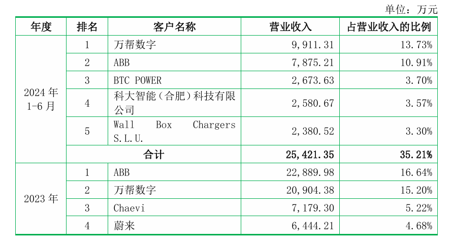 此外,2022年下半年,ABB指定其充电桩代工厂向优优绿能采购充电模块。2022年、2023年和2024年上半年,公司向ABB指定代工厂销售金额合计分别为3353.64万元、5864.37万元和576.22万元,占营业收入的比例分别为3.39%、4.26%和0.80%。
