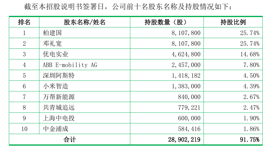 股权方面,招股书显示,优优绿能实际控制人为柏建国和邓礼宽,二人合计持有该公司56.70%的股权。2019年—2022年,万帮新能源、深圳阿斯特、ABB、小米智造等公司陆续入股。