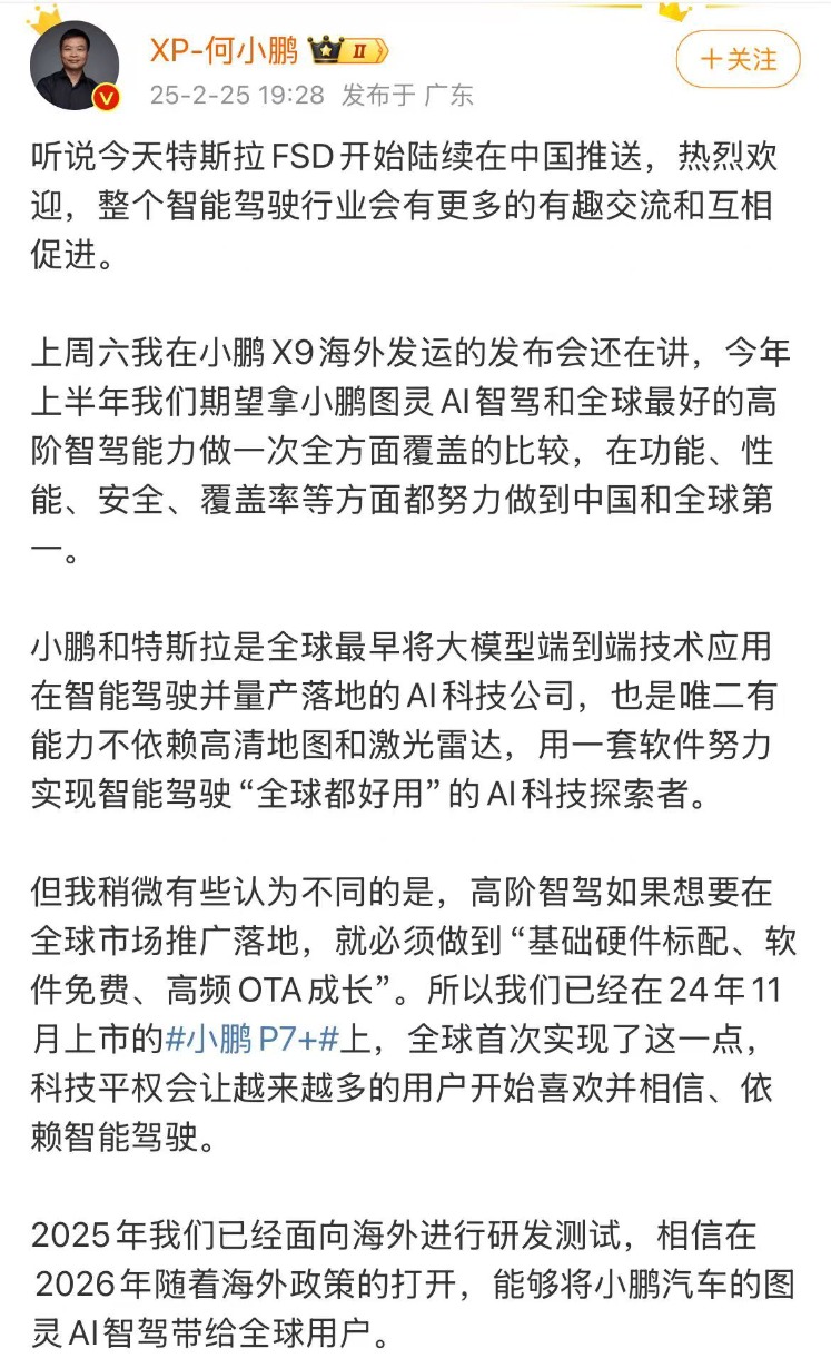 就何小鹏此次发表的言论来看,其依旧欢迎特斯拉FSD入华,并强调小鹏和特斯拉是全球最早将大模型端到端技术应用在智能驾驶并量产落地的AI科技公司。