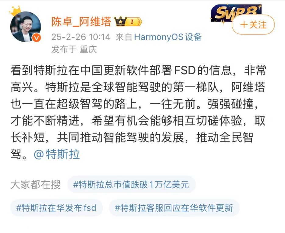 此外,阿维塔科技总裁陈卓也在社交平台上表达了对特斯拉FSD入华的欢迎。他表示:“看到特斯拉在中国更新软件部署FSD的信息,非常高兴。特斯拉是全球智能驾驶的第一梯队,阿维塔也一直在超级智驾的路上,一往无前。强强碰撞,才能不断精进,希望有机会能够相互切磋体验,取长补短,共同推动智能驾驶的发展,推动全民智驾。”