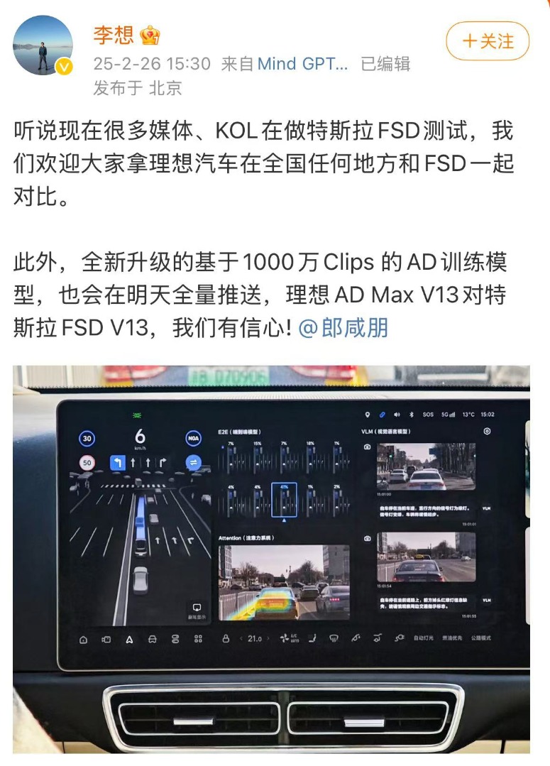 理想汽车CEO李想也连发了两条与特斯拉相关的微博,并从竞争的角度表达了对特斯拉的敬意。“听说现在很多媒体、KOL在做特斯拉FSD测试,我们欢迎大家拿理想汽车(的产品)在全国任何地方和FSD一起对比。”李想透露,理想汽车基于1000万Clips的AD训练模型已进行升级,并在2月27日推送,可以与特斯拉在智能驾驶的道路实战中一较高下。