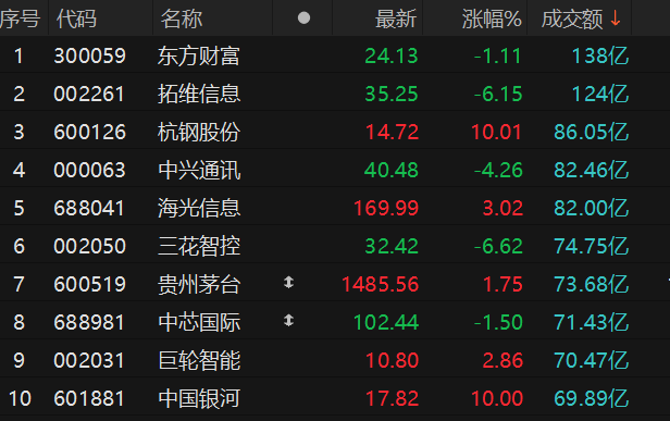 个股方面,东方财富成交额居首,为138亿元。其次是拓维信息、杭钢股份、中兴通讯,成交额分别为124亿元、86亿元、82亿元。