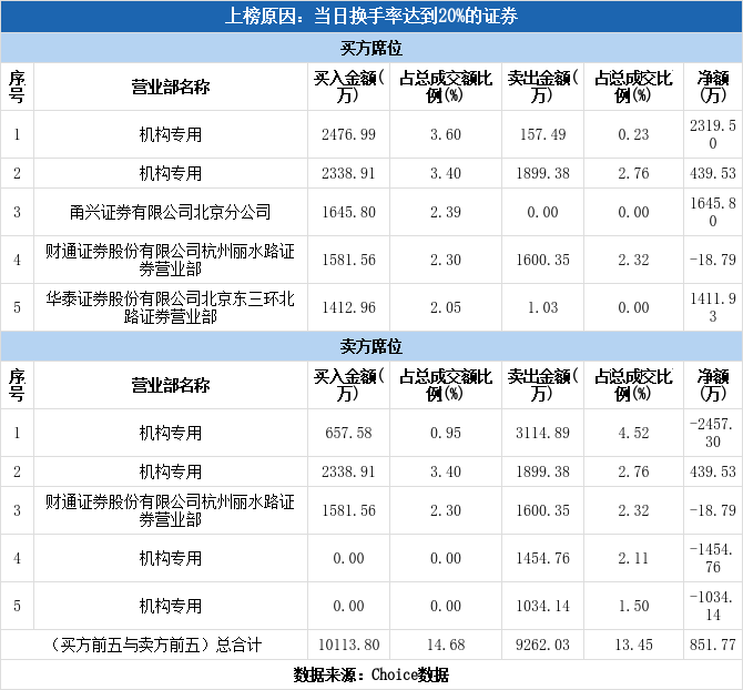 龙虎榜数据显示,今日共6个机构席位出现在龙虎榜单上,分别位列买一、买二、卖一、卖二、卖四、卖五,合计净卖出2187.16万元,占该股今日总成交额的3.18%。