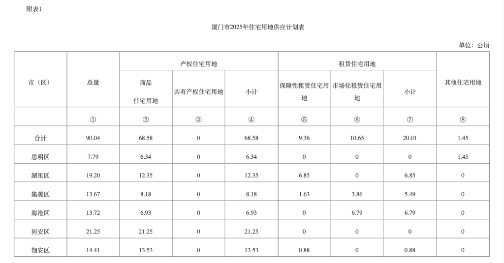 值得一提的是,厦门今年岛内商品住宅用地无论是供应宗数还是土地面积都大幅增长。与2024年计划供应相比,岛内两区今年供应10宗商品住宅用地,比去年多供应8宗,供应土地面积18.69公顷同比增加370.78%。