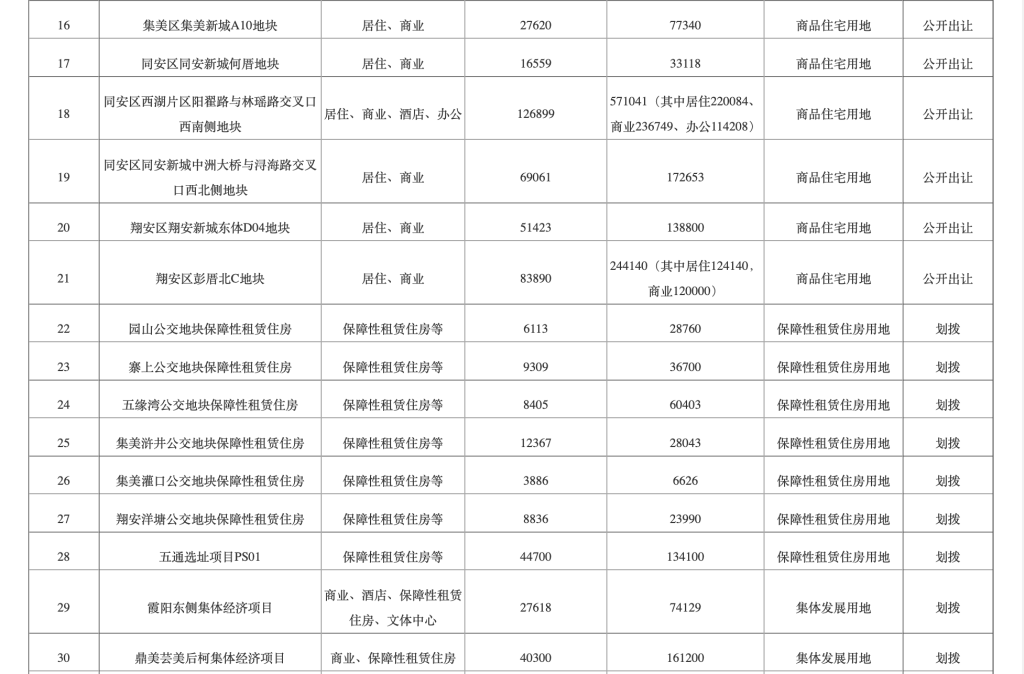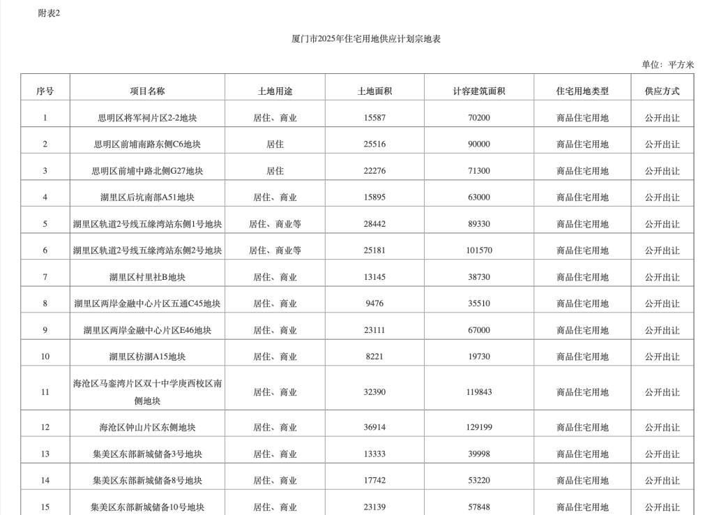 根据厦门市2025年住宅用地供应计划宗地表,32宗地块中,居住、商业用途地块共计21宗,分别为岛内思明区3宗、湖里区7宗,岛外海沧区2宗、集美区4宗、同安区3宗、翔安区2宗。