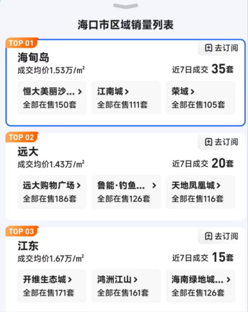 其中,海甸岛片区过去7日共成交二手房35套,成交靠前的小区包括恒大美丽沙天璟湾、江南城、荣域等项目;远大片区的热门二手房项目包括远大购物广场、鲁能·钓鱼台·美高梅、天地凤凰城等;江东片区的热门二手房项目包括开维生态城、鸿洲江山、海南绿地城骏园等。