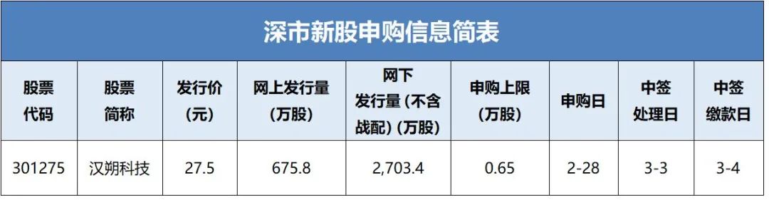 2025年2月28日,汉朔科技股份有限公司(简称:汉朔科技)将通过深交所网下发行电子平台和交易系统发行新股,具体信息如下。