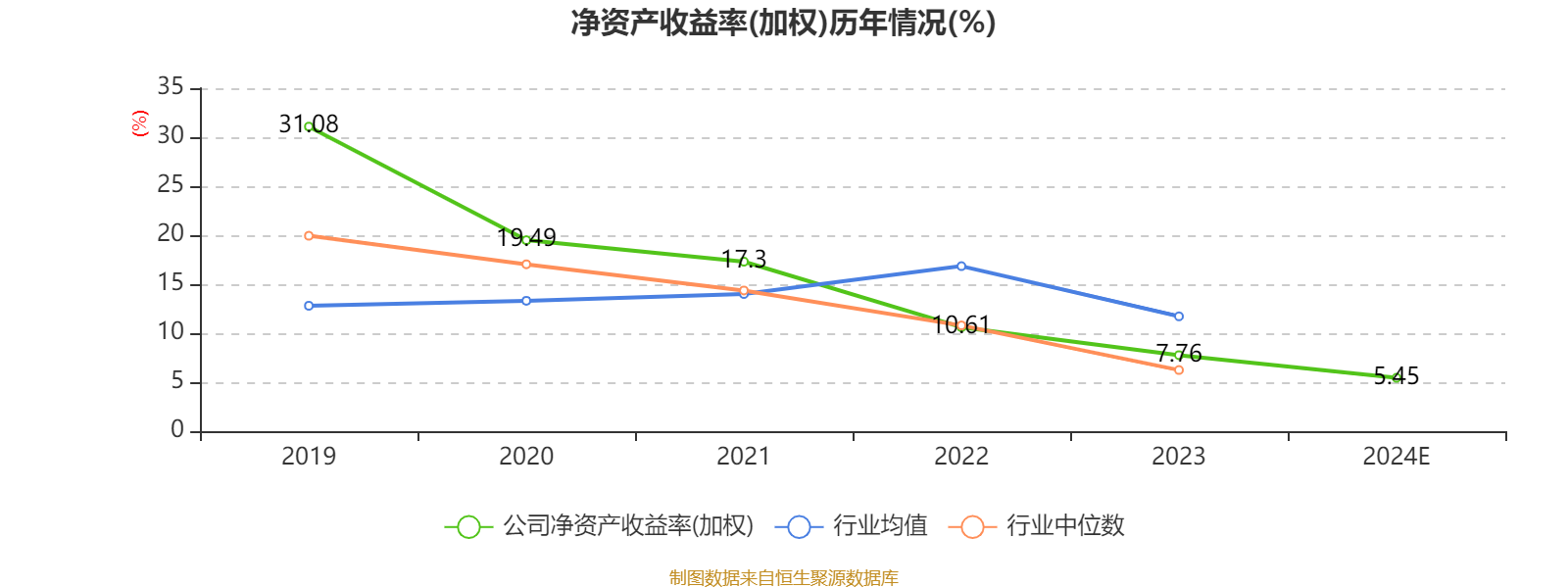 数据显示,2024年公司加权平均净资产收益率为5.45%,较上年同期下降2.31个百分点。