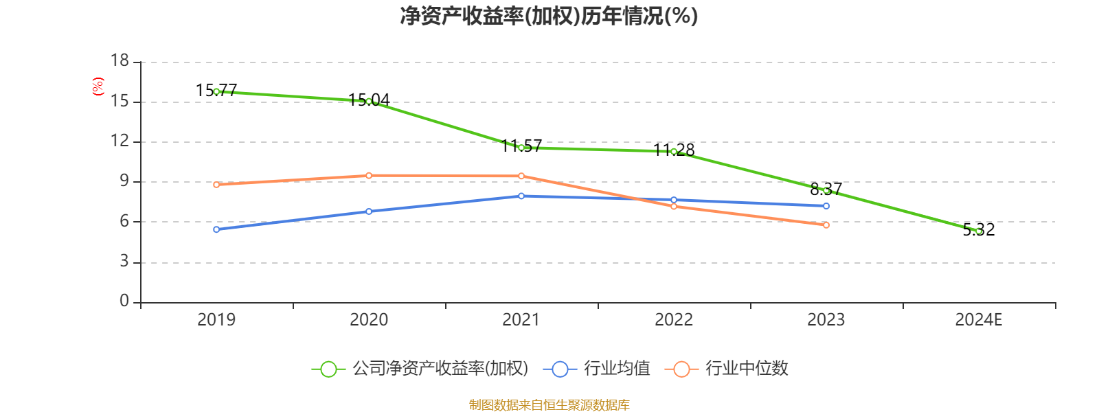 数据显示,2024年公司加权平均净资产收益率为5.32%,较上年同期下降3.05个百分点。