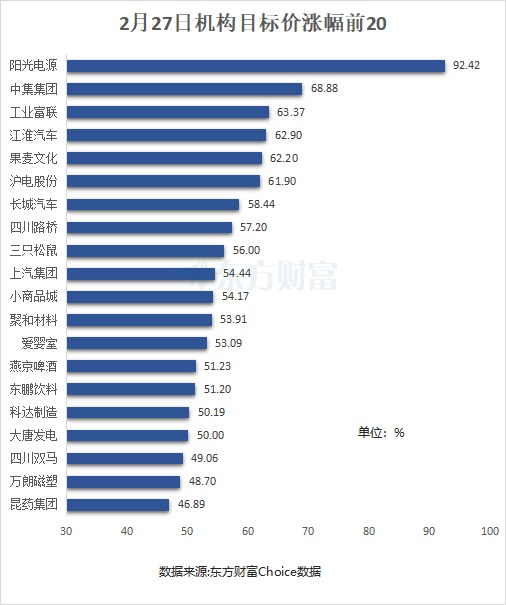 以近一月券商研报为样本,按机构目标价(有多家券商给出目标价的,取最大值)和最新收盘价相比,截至2月26日收盘,阳光电源上涨空间最大,为92.42%。