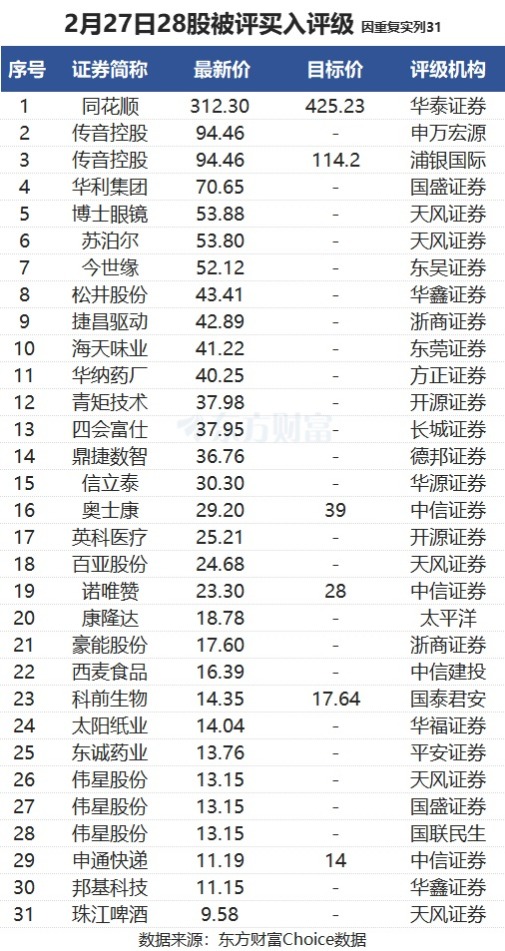 东方财富Choice数据显示,截至2月27日19点,当天有28股被券商评为买入评级,包括传音控股、苏泊尔、今世缘、海天味业、申通快递、珠江啤酒等股票。