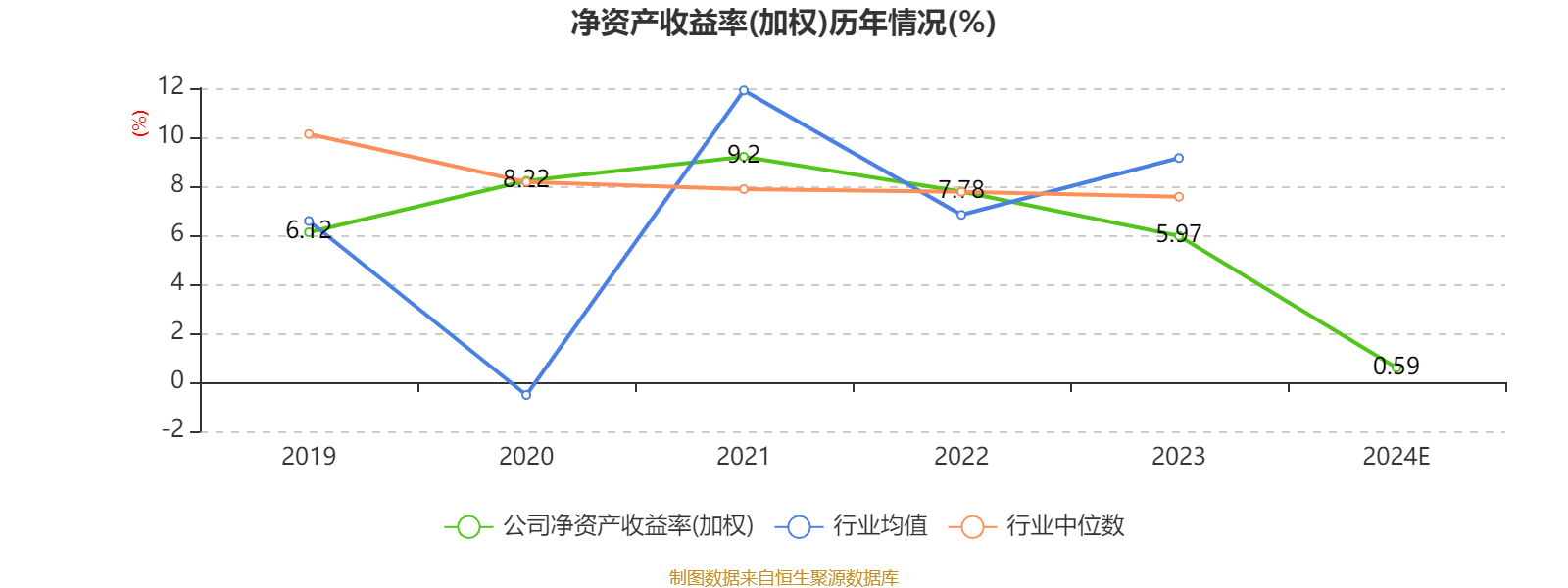 数据显示,2024年公司加权平均净资产收益率为0.59%,较上年同期下降5.38个百分点。