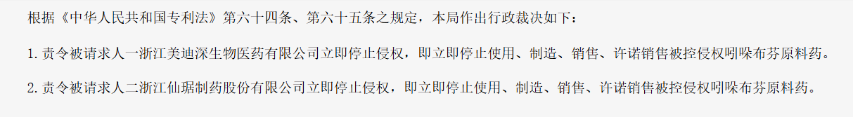 21世纪经济报道记者进一步查询发现,杭州市知识产权局在2024年7月30日披露了上述裁决书。其中,杭州中美华东(华东医药全资子公司)作为请求人,称其向国家知识产权局专利局递交的“吲哚布芬晶型D及其制备方法”已合法有效。依照相关规定,杭州知识产权局责令九典制药、同伍生物立即停止使用、制造、销售、许诺销售侵权产品行为。