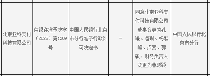 同时,北京亚科支付科技有限公司的重大事项变更也获得批准。根据京银许准予决字〔2025〕第1209号,亚科支付的董事变更为孔谦、潘琪、杨献峰、卢嘉、郭敏,财务负责人变更为曹聪颖。