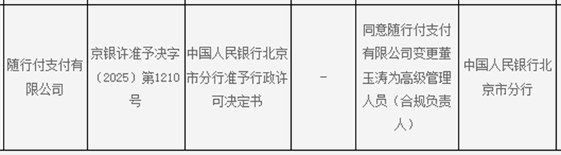 蓝鲸新闻2月27日(记者黄玉洁)日前,中国人民银行北京市分行发布了新的“非银行支付机构重大事项变更许可信息公示”,其中随行付支付有限公司的重大事项变更获得批准。根据京银许准予决字〔2025〕第1210号,随行付支付有限公司变更董玉涛为高级管理人员(合规负责人)。