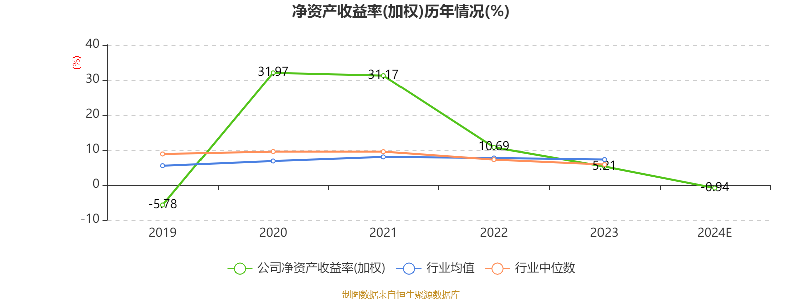 数据显示,2024年公司加权平均净资产收益率为-0.94%,较上年同期下降6.15个百分点。