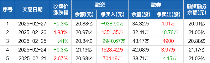 融资方面,当日融资买入1.12亿元,融资偿还1.21亿元,融资净偿还938.9万元。融券方面,融券卖出10.46万股,融券偿还8.55万股,融券余量34.32万股,融券余额342.17万元。融资融券余额合计20.91亿元。