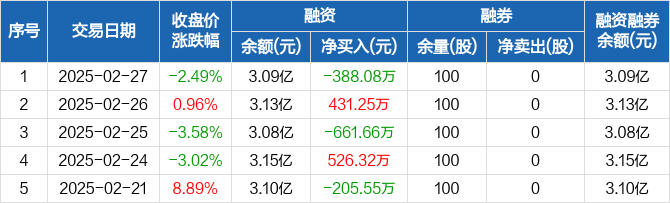 融资方面,当日融资买入3154.78万元,融资偿还3542.86万元,融资净偿还388.08万元。融券方面,融券卖出0股,融券偿还0股,融券余量100股,融券余额823元。融资融券余额合计3.09亿元。