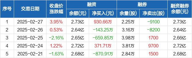 融资方面,当日融资买入3149.77万元,融资偿还2219.11万元,融资净买入930.66万元。融券方面,融券卖出1.24万股,融券偿还2.15万股,融券余量2.25万股,融券余额26.66万元。融资融券余额合计2.73亿元。