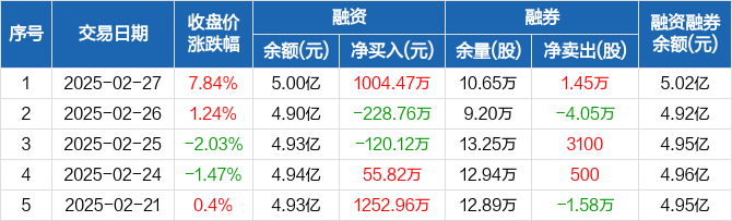 新开源融资融券信息显示,2025年2月27日融资净买入1004.47万元;融资余额5亿元,较前一日增加2.05%