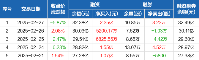 新易盛融资融券信息显示,2025年2月27日融资净买入2.35亿元;融资余额32.38亿元,较前一日增加7.82%。