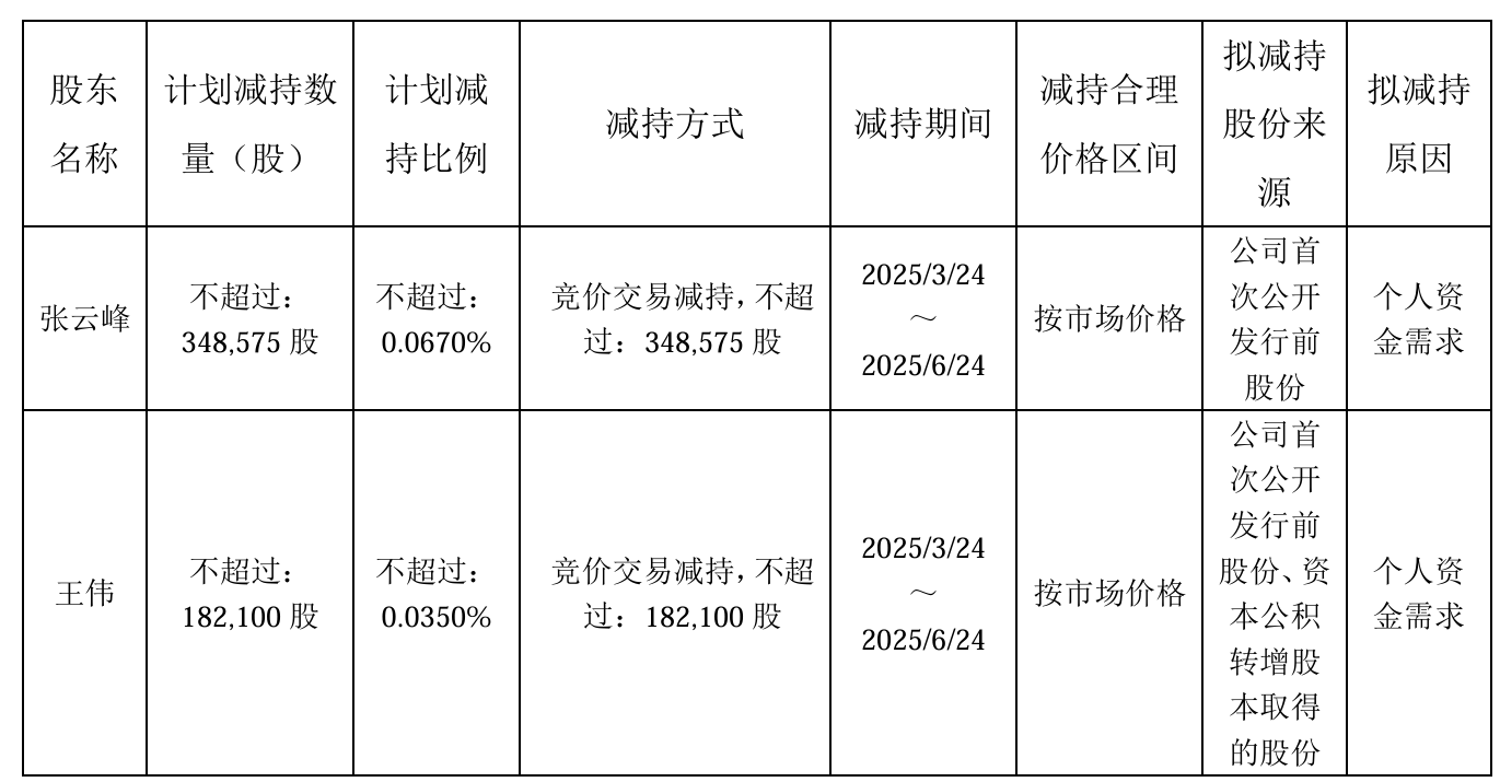公告显示,减持期间为3月24日至6月24日,减持方式为竞价交易减持。截至披露日,公司董事、副总裁张云峰持有公司股份139.43万股,占公司总股本的0.2679%;公司董事、副总裁兼财务负责人王伟持有公司股份72.84万股,占公司总股本的0.1399%。