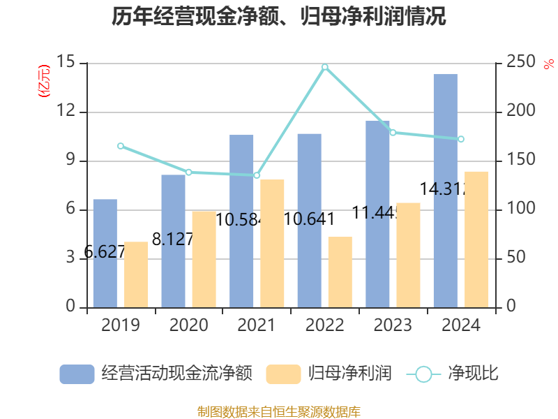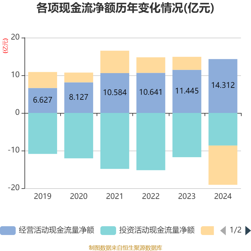 截至2024年,公司经营活动现金流净额为14.31亿元,同比增长25.05%;筹资活动现金流净额-10.43亿元,同比减少13.89亿元;投资活动现金流净额-8.65亿元,上年同期为-11.75亿元。