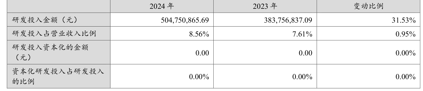 2024年全年,公司研发投入金额为5.05亿元,同比增长31.53%;研发投入占营业收入比例为8.56%,相比上年同期上升0.95个百分点。此外,公司全年研发投入资本化率为0%。