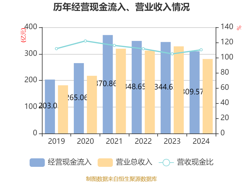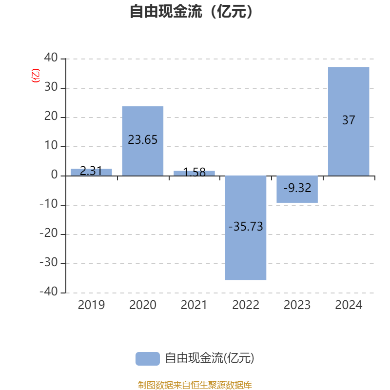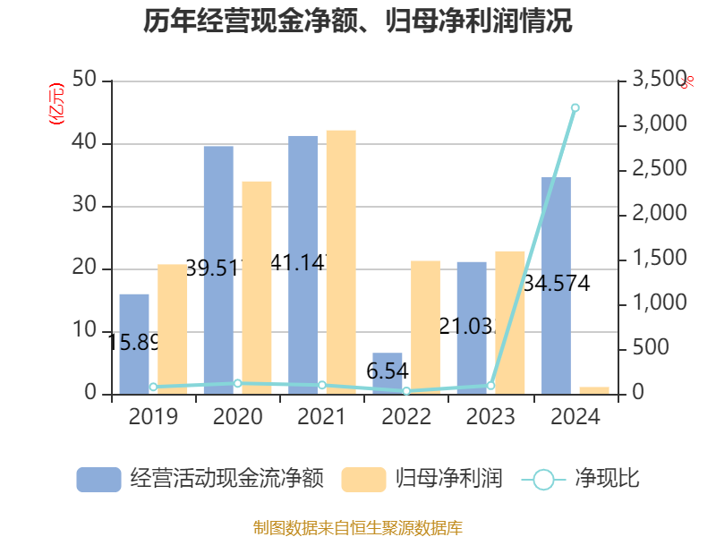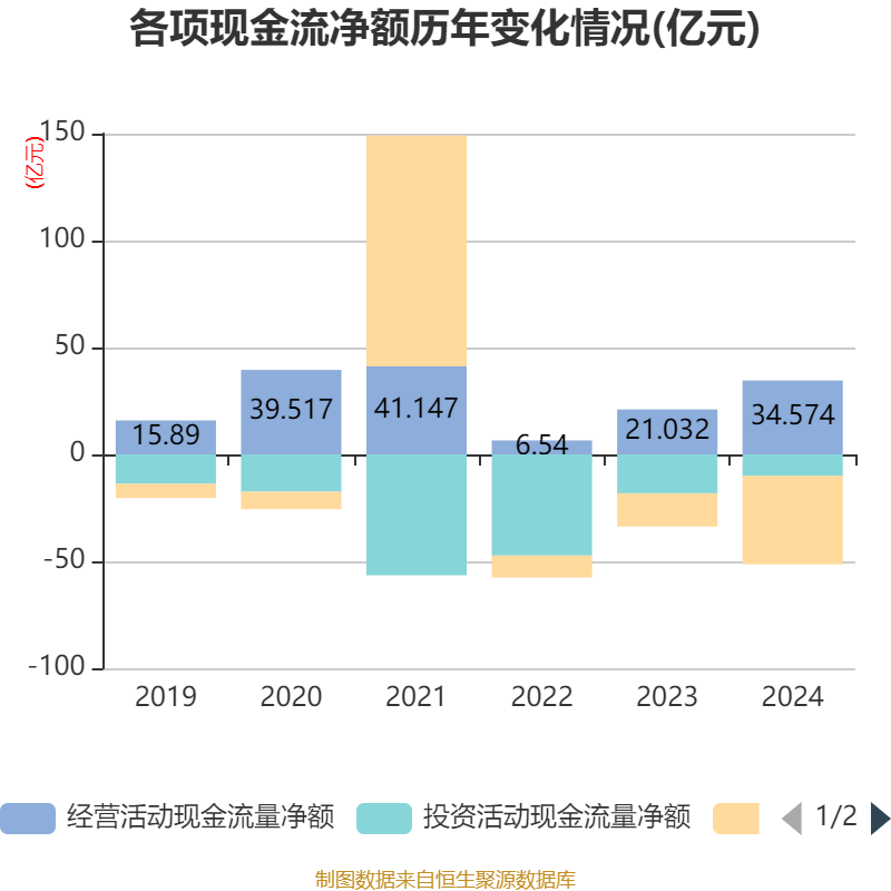 截至2024年,公司经营活动现金流净额为34.57亿元,同比增长64.39%;筹资活动现金流净额-41.43亿元,同比减少25.88亿元;投资活动现金流净额-9.97亿元,上年同期为-18.18亿元。