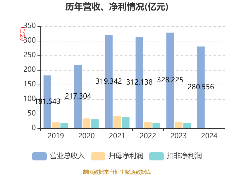 中证智能财讯东方雨虹(002271)2月28日披露2024年年度报告。2024年,公司实现营业总收入280.56亿元,同比下降14.52%;归母净利润1.08亿元,同比下降95.24%;扣非净利润1.24亿元,同比下降93.28%;经营活动产生的现金流量净额为34.57亿元,同比增长64.39%;报告期内,东方雨虹基本每股收益为0.0435元,加权平均净资产收益率为0.41%。公司2024年度分配预案为:拟向全体股东每10股派现18.5元(含税)。