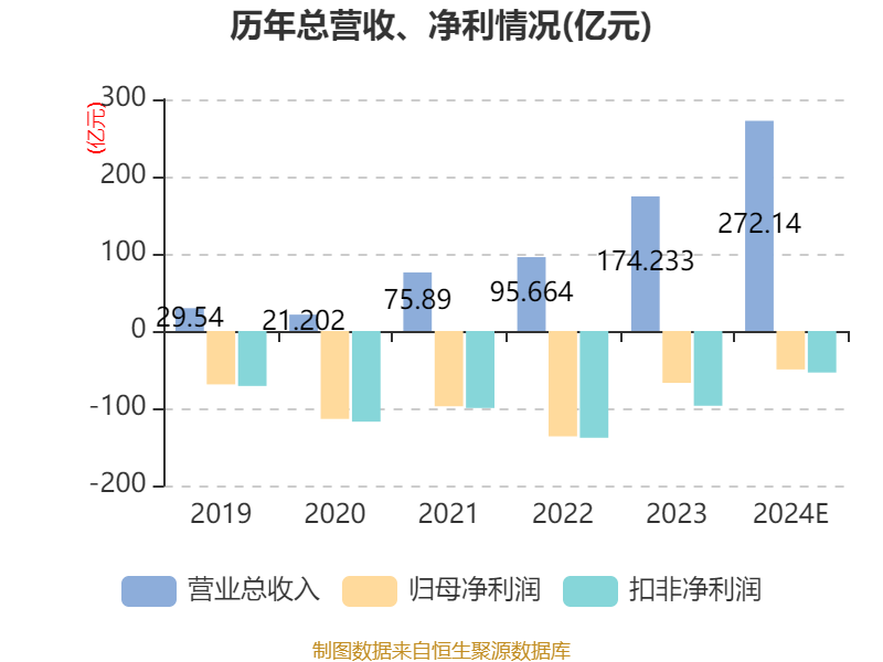 中证智能财讯百济神州(688235)2月27日晚间披露2024年业绩快报,公司实现营业收入272.14亿元,同比增长56.2%;归母净利润亏损49.78亿元,上年同期亏损67.16亿元;扣非净利润亏损53.79亿元,上年同期亏损96.82亿元;基本每股收益-3.64元,加权平均净资产收益率为-20.2%。以最新收盘价计算,市净率(LF)约12.97倍,市销率(TTM)约13.24倍。