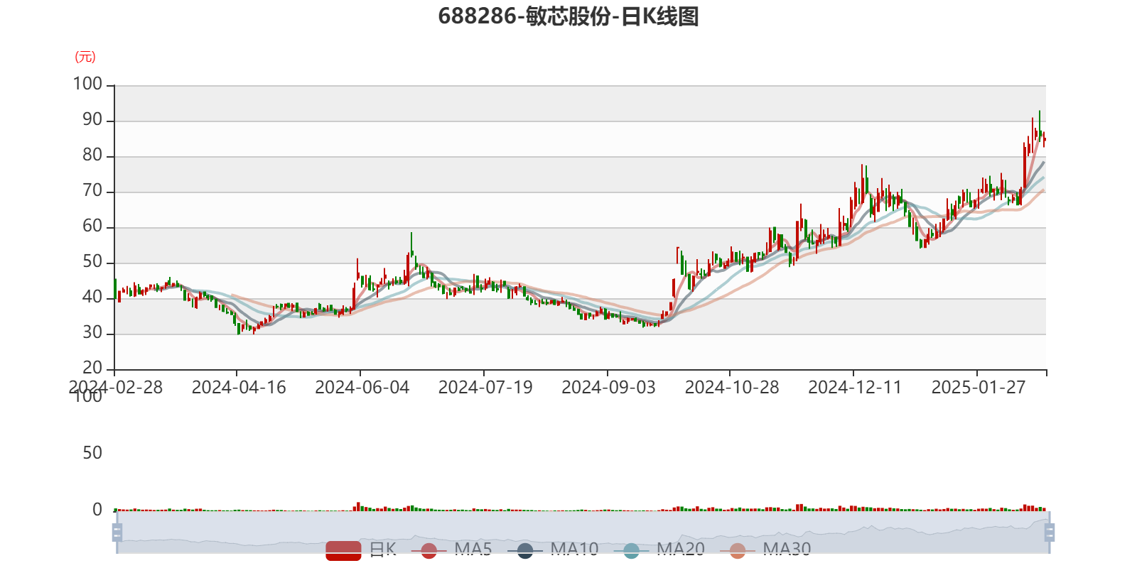 中证智能财讯敏芯股份(688286)2月27日晚间披露2024年业绩快报,公司实现营业收入5.06亿元,同比增长35.75%;归母净利润亏损3489.71万元,上年同期亏损1.02亿元;扣非净利润亏损3476.04万元,上年同期亏损1.1亿元;基本每股收益-0.63元,加权平均净资产收益率为-3.34%。以最新收盘价计算,市净率(LF)约4.7倍,市销率(TTM)约10.57倍。