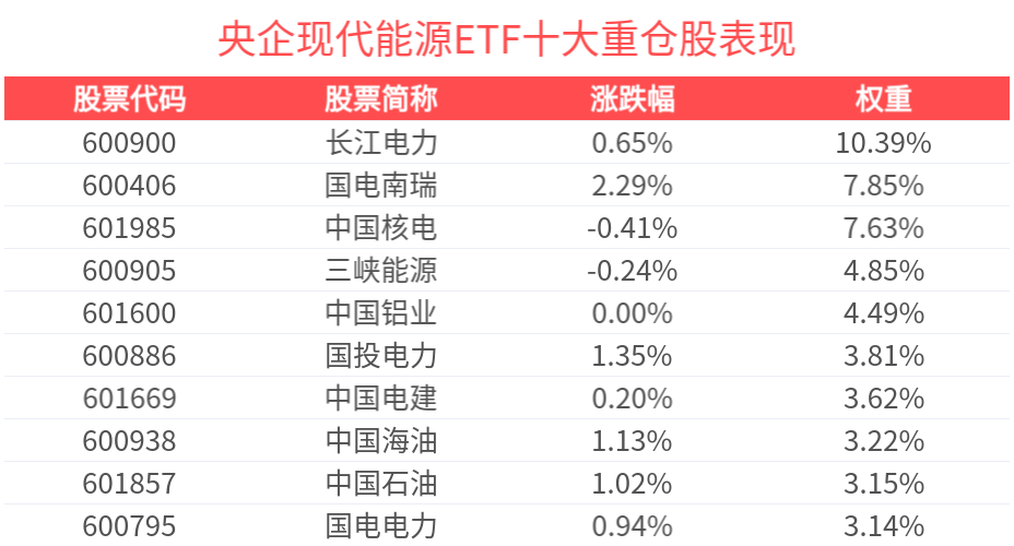 数据显示,截至2025年1月27日,中证国新央企现代能源指数(932037)前十大权重股分别为长江电力(600900)、国电南瑞(600406)、中国核电(601985)、中国铝业(601600)、三峡能源(600905)、中国电建(601669)、国投电力(600886)、中国海油(600938)、中国石油(601857)、国电电力(600795),前十大权重股合计占比51.75%。