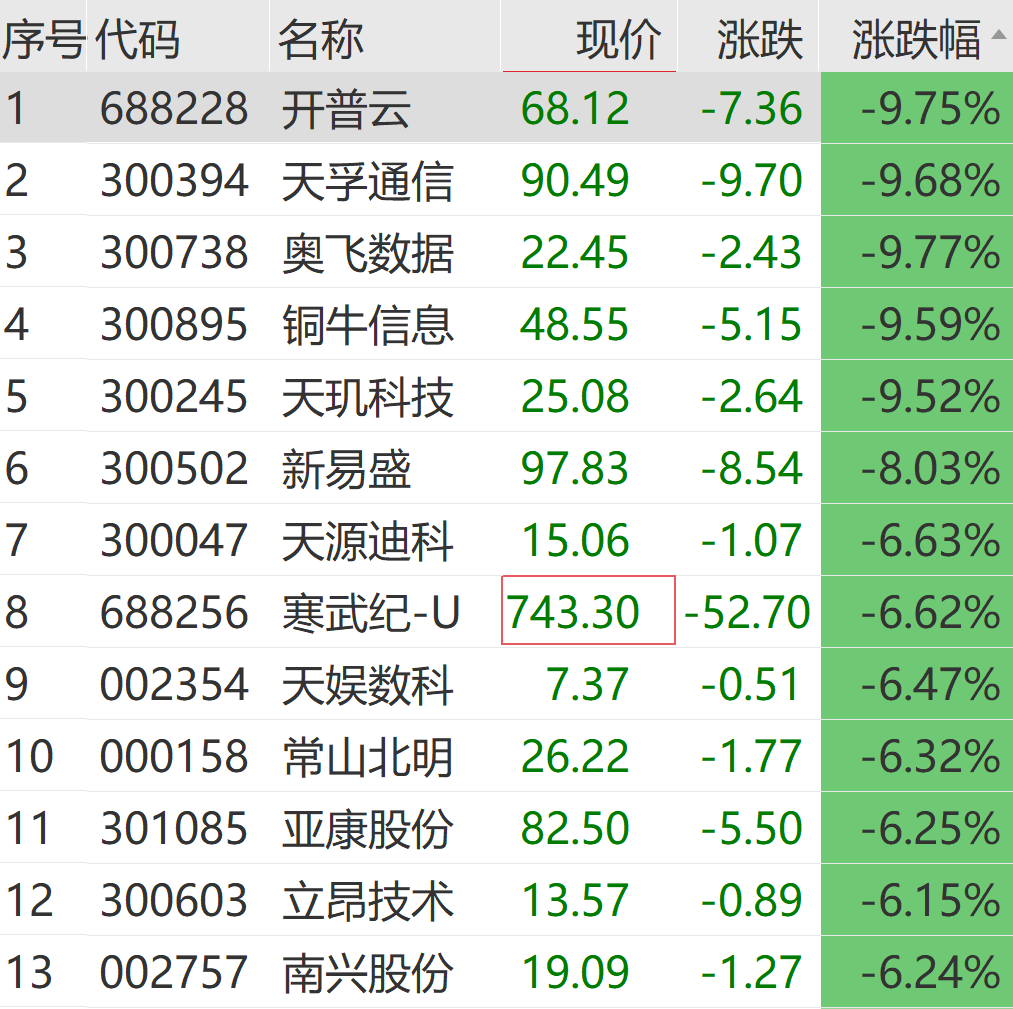 算力板块集体走低,开普云、奥飞数据、铜牛信息、天玑科技等均跌超9%,寒武纪、常山北明跌超6%。