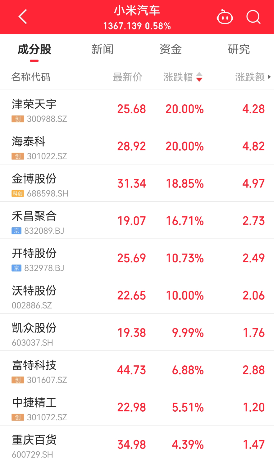 2月28日,小米汽车概念股开盘走强,津荣天宇、海泰科20CM涨停,沃特股份、凯众股份涨停。