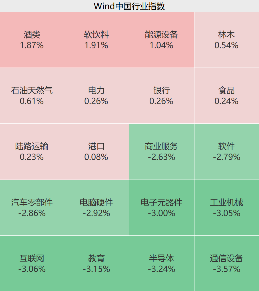 盘面上,上午通信设备、半导体、互联网等行业不振,光模块、光通信、AI算力、宇树机器人等概念大幅走低;食品饮料、能源设备、银行等板块仍保持一定景气度。