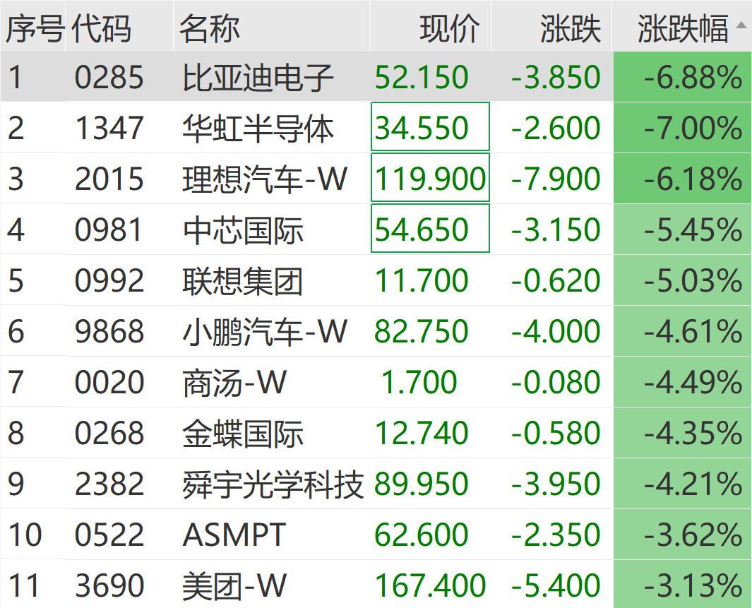 港股今日同样小幅低开,上午同步走低。截至发稿,恒生科技指数跌超3%;比亚迪电子、华虹半导体领跌恒生科技指数成份股。