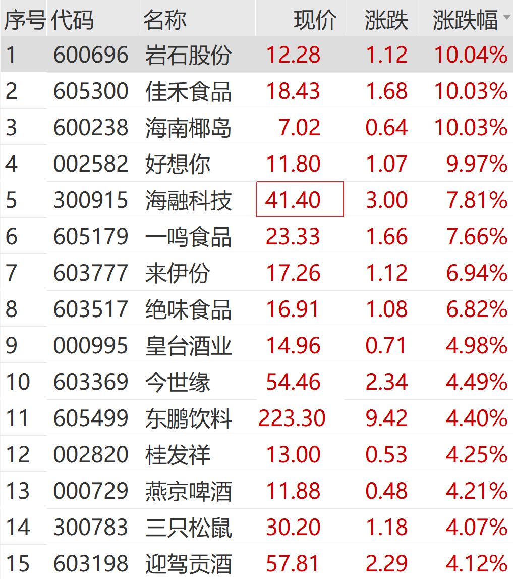 上午消费板块整体活跃,食品饮料概念股大涨;岩石股份、佳禾食品、海南椰岛、好想你等多股集体涨停。