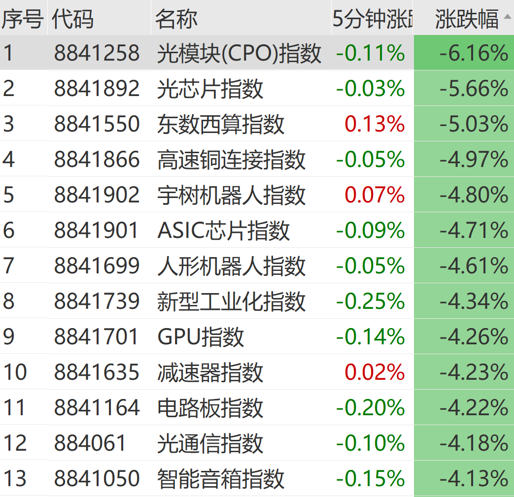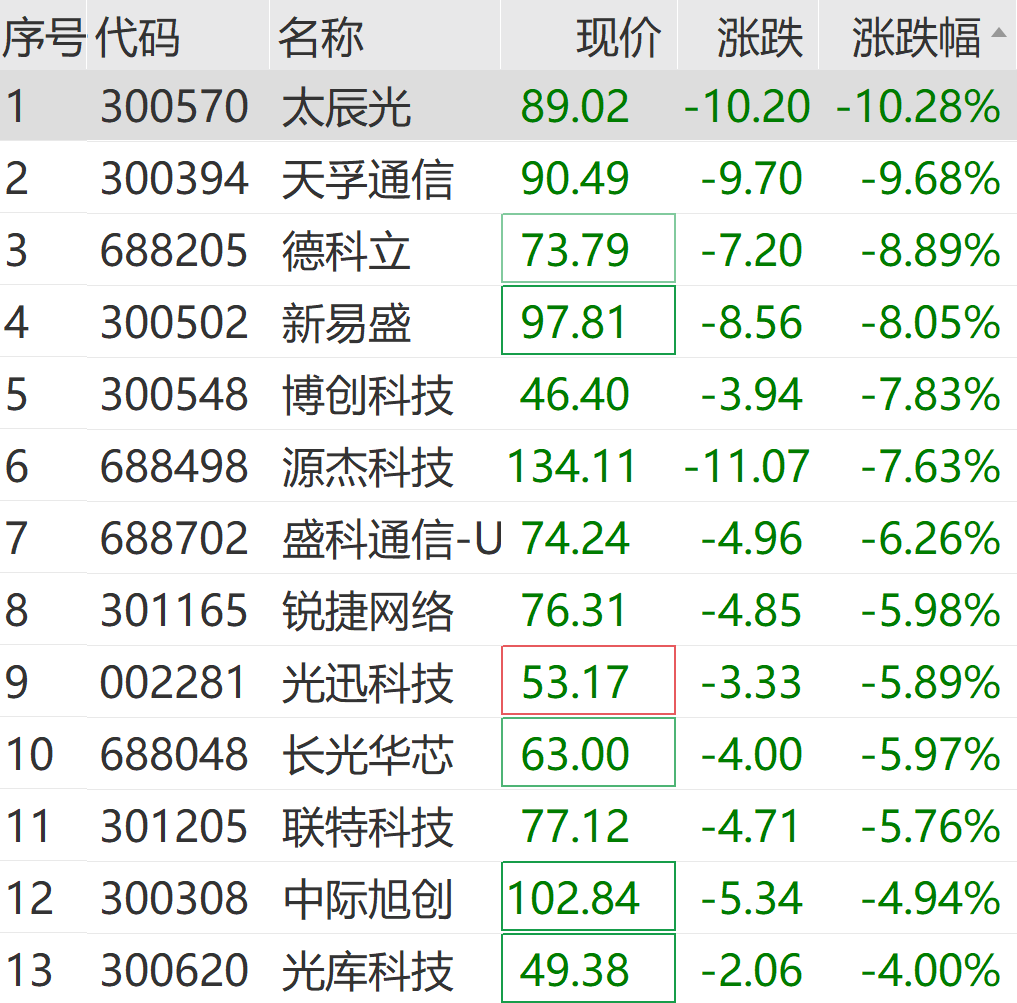 光模块概念大跌,天孚通信、太辰光、新易盛、中际旭创等热门股集体走低。