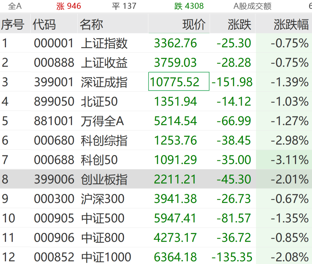 A股主要指数早间集体低开,上午持续震荡下行。截至发稿,深证成指跌超1%,创业板指跌超2%,科创50指数跌超3%。
