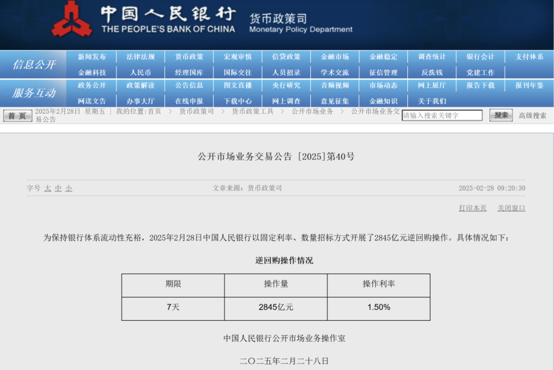 首先来看央行动作:为保持银行体系流动性充裕,2月28日中国人民银行开展2845亿元7天逆回购操作,操作利率为1.5%。Wind数据显示,当日1825亿元逆回购到期。