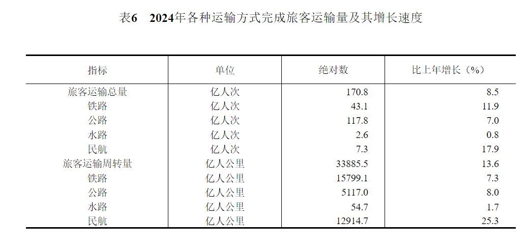 [29]自2024年1月起,公路旅客运输量、公路旅客运输周转量统计口径进行了调整,将班车包车客运量、公共汽电车城际城乡客运量、出租汽车(含巡游出租汽车、网络预约出租汽车)城际城乡客运量纳入公路旅客运输量统计,公路旅客运输周转量统计口径相应调整。2024年旅客运输总量、旅客运输周转量、公路旅客运输量、公路旅客运输周转量增速按可比口径计算。